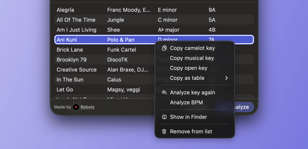 Analyze your entire music collection in one go with minimal CPU and memory usage. Process hundreds of tracks in seconds, using Camelot Wheel, musical, or open key notation.